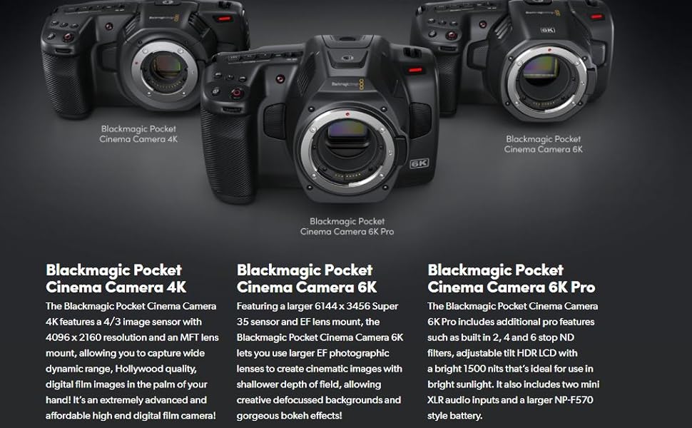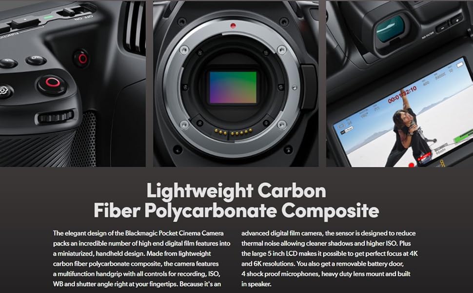 Le facteur de forme très compact est doté d’un corps composite renforcé de fibres de carbone qui le rend extrêmement durable et léger afin que vous puissiez l’emporter n’importe où. Vous obtenez un écran super lumineux de 5 , 4 microphones intégrés, des enregistreurs intégrés et des boutons et cadrans externes qui vous donnent un accès rapide aux fonctions les plus importantes. Cela signifie que vous pouvez rapidement vérifier le cadrage et la mise au point, capturer l’audio et enregistrer vos fichiers sans avoir à transporter des moniteurs, des microphones, des enregistreurs et des câbles supplémentaires. Vous obtenez également de nombreux points de montage, une entrée mini XLR avec alimentation fantôme, un contrôle Bluetooth et plus encore. Avec la Blackmagic Pocket Cinema Camera 4K, vous obtenez une caméra de film numérique portable entièrement équipée, flexible et extensible! 4K Digital Film Sensor La Blackmagic Pocket Cinema Camera 4K dispose d’un capteur 4/3 pleine grandeur qui vous donne une résolution de 4096 x 2160 avec une plage dynamique incroyable de 13 arrêts pour une véritable qualité de film numérique. Parce qu’il est pleine grandeur, le capteur 4/3 réduit le facteur de recadrage, vous donnant un champ de vision plus large. Il a également deux ISO natifs jusqu’à 25 600 afin que vous obteniez des performances incroyables en basse lumière! La Blackmagic Pocket Cinema Camera 4K peut enregistrer jusqu’à 60 images par seconde en 4K et jusqu’à 120 images par seconde pour la HD fenêtrée. La caméra dispose de la science des couleurs Blackmagic Design de quatrième génération avec des modes film, vidéo et vidéo étendus. Le nouveau mode étendu vous donne la latitude du film avec la commodité de la vidéo, de sorte que vous obtenez de superbes images sans avoir à faire beaucoup de travail en post-production! MFT Lens Mount La Blackmagic Pocket Cinema Camera 4K utilise la même monture d’objectif MFT (Micro Four Thirds) que la Pocket Cinema Camera d’origine afin que vous puissiez utiliser les objectifs que vous avez déjà! La monture d’objectif MFT a été conçue spécifiquement pour les boîtiers d’appareil photo plus petits avec une distance focale de bride plus courte. Cela signifie que vous pouvez obtenir des lentilles professionnelles de haute qualité qui sont beaucoup plus petites que jamais! La monture MFT est extrêmement flexible et permet différents adaptateurs d’objectif. Vous pouvez obtenir des adaptateurs pour PL, C, EF et plus encore, de sorte que vous pouvez utiliser des objectifs de fabricants tels que Canon, Nikon, Pentax, Leica et même Panavision! Recording Media Quand il s’agit d’enregistrer, la Blackmagic Pocket Cinema Camera 4K vous offre 3 types de médias parmi lesquels choisir. Les images peuvent être enregistrées sur des cartes SD standard, des cartes UHS-II plus rapides ou des cartes CFast 2.0. La vidéo haute définition peut être enregistrée à l’aide de cartes SD bon marché ordinaires. Les cartes UHS-II plus performantes peuvent être utilisées pour enregistrer en Ultra HD dans ProRes jusqu’à 60 images par seconde et RAW jusqu’à 30 images par seconde. Les cartes CFast peuvent enregistrer du RAW 12 bits à toutes les fréquences d’images prises en charge. Pour des temps d’enregistrement plus longs, vous pouvez également enregistrer directement sur un SSD externe ou un disque flash à l’aide du port d’extension USB-C intégré! Mieux encore, il n’y a rien de propriétaire. Les fichiers fonctionneront avec tous les logiciels de post-production professionnels. Vous pouvez même monter les cartes multimédias sur votre ordinateur et commencer à les éditer directement à partir d’elles à l’aide du logiciel DaVinci Resolve Studio inclus!