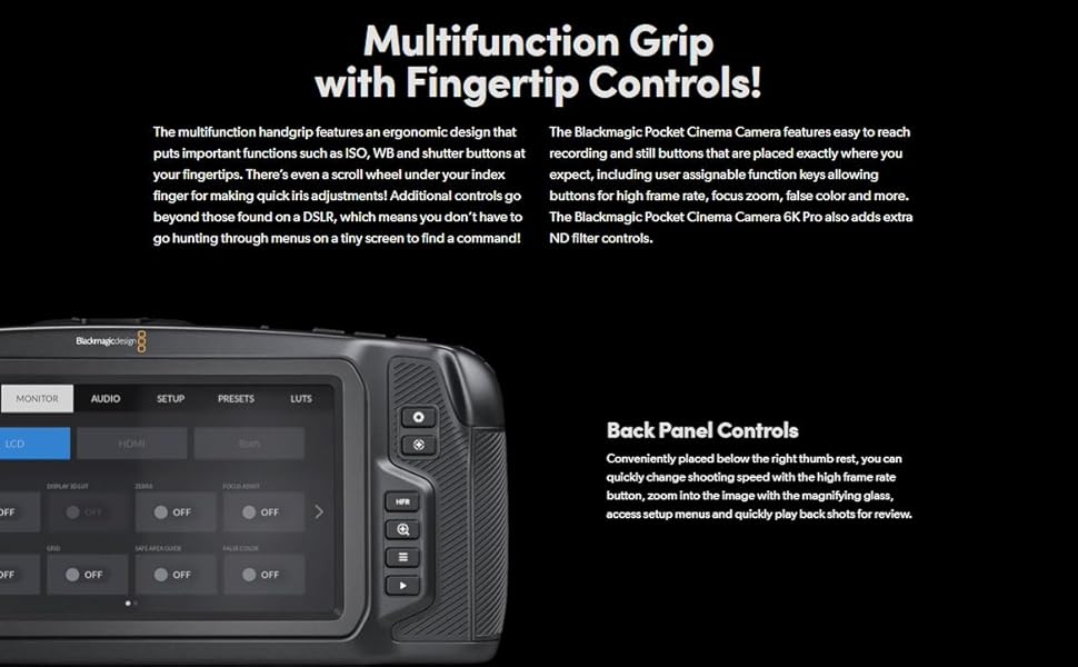 Il est parfait pour tourner des films et des documentaires indépendants, des défilés de mode, des blogs de voyage, des vidéos Web, des mariages, des vidéos d’entreprise, des sports et plus encore. L’incroyable qualité d’image, la science avancée des couleurs blackmagic Design et les fonctionnalités d’enregistrement RAW vous permettent de prendre des images qui rivalisent avec les appareils photo numériques professionnels coûtant des dizaines de milliers de plus. Cela signifie que vous obtenez la qualité d’image dont vous avez besoin pour mélanger de manière transparente les séquences de la Blackmagic Pocket Cinema Camera 4K avec d’autres types de caméras utilisées sur les longs métrages hollywoodiens haut de gamme et les émissions de télévision épisodiques! Elegant Modern Design La conception portable portable de la Blackmagic Pocket Cinema Camera 4K vous offre une mobilité incroyable sans sacrifier les fonctionnalités.
