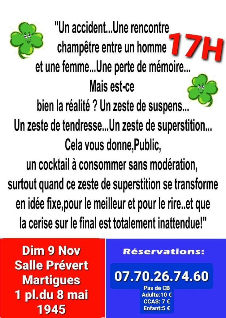 Si vous êtes de passage à Martigues, où que vous habitez dans les environs n’hésitez pas à aller voir cette excellente comédie. Un jour, ils ont eu un accident. Ils se sont rencontrés.